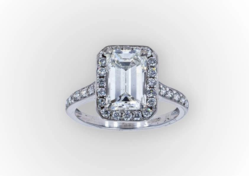 DescriptionAn emerald cut diamond in the center of this gorgeous 18 ct white gold ring is surrounded by glittering brilliant cut diamonds, which together weigh about 3.00 cts. A timeless classic to wear for many years to come, this exquisite ring features more diamonds that fall over the shoulders. |
