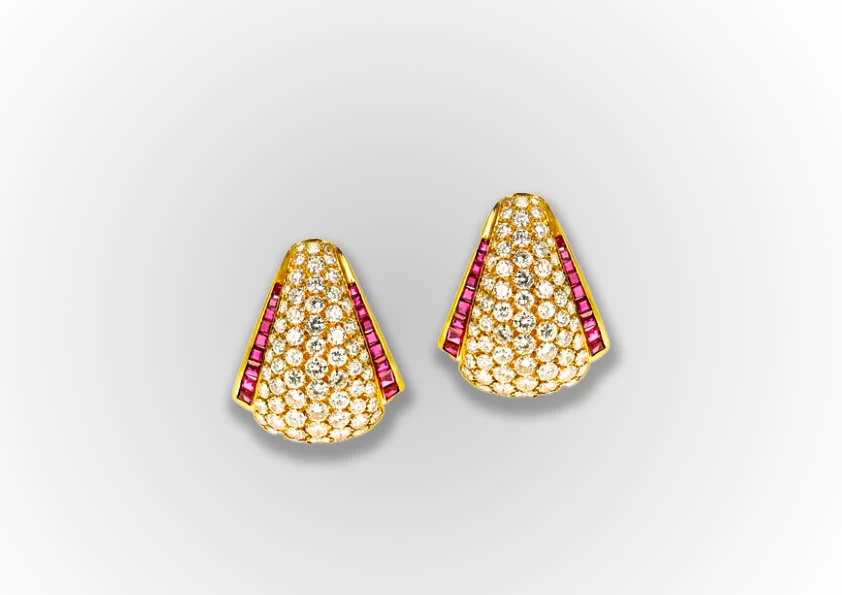 The Van Cleef & Arpels' 18 Karat Yellow Gold Diamond and Ruby Cocktail Earrings date back to the 1960s. These earrings feature a unique design with diamonds and rubies set in yellow gold, they are perfect for adding a touch of elegance to any outfit and are sure to be a conversation starter.