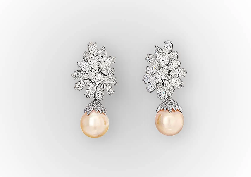 These earrings are perfect for a special occasion or as a luxurious gift. The combination of platinum, 26ct diamonds, and South Sea pearls creates a timeless and elegant look that will never go out of style. They consist of two matched Pearls of fine luster 0.5 inch, set with fine brilliant cut marquise diamonds of F-G color and VS1-VS2 clarity. The earrings fasten with a clip omega clasp.