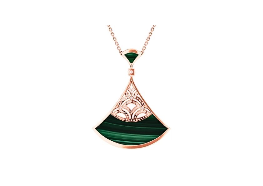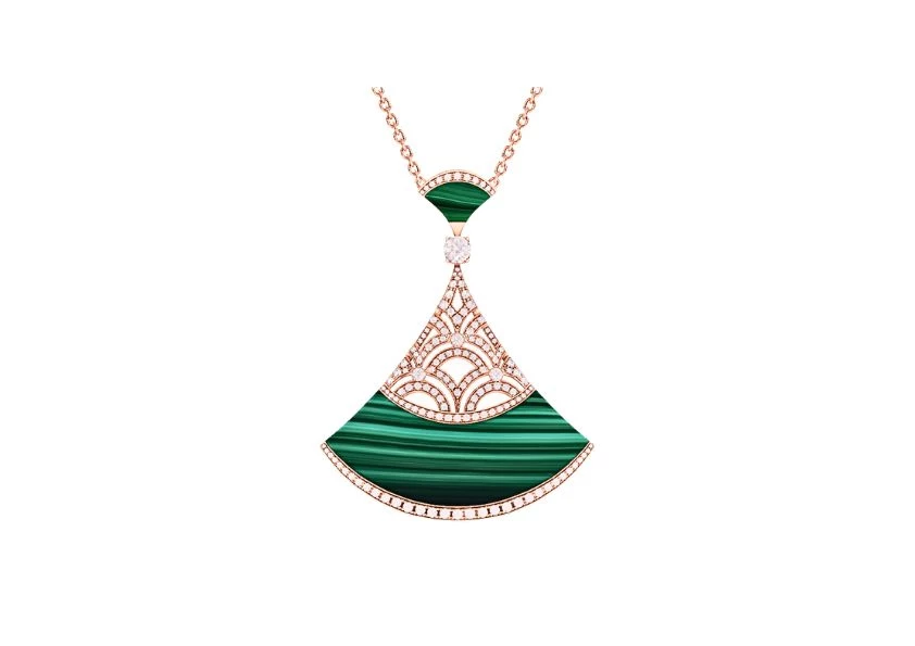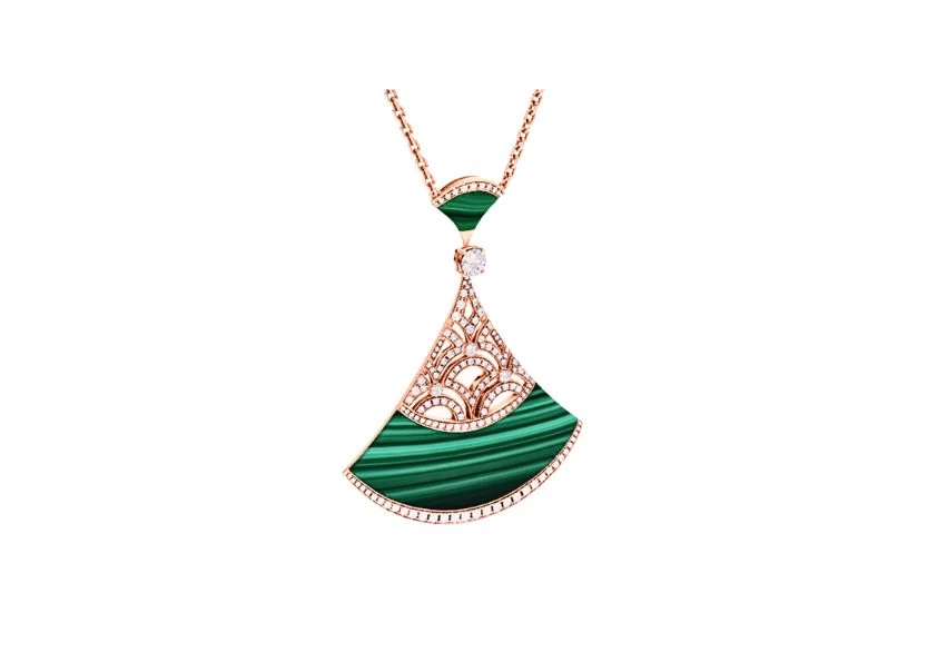 Introducing the Preloved: DIVAS' DREAM Necklace - a true testament to the allure and grace of Italian beauty. This exquisite piece pays homage to the most glamorous divas, exuding an unmistakable Roman spirit that is bound to captivate all who lay eyes on it.  Crafted with meticulous attention to detail, the DIVAS' DREAM necklace is the epitome of femininity and refinement. Its fan-shaped motif draws inspiration from the vibrant mosaics adorning the Roman Baths of Caracalla, infusing the piece with a sense of timeless elegance.  The necklace boasts a stunning interplay between dazzling openwork elements and vibrant malachite inserts. Each delicate detail has been carefully designed to create a harmonious fusion of sophistication and allure. The lustrous 18 kt rose gold pendant serves as a testament to the necklace's luxurious appeal, while the brilliant-cut diamond and pavé diamonds add a touch of mesmerizing sparkle.  Wearing the DIVAS' DREAM necklace is like stepping into a world of opulence and grandeur. It effortlessly elevates any ensemble, making a bold statement that is impossible to ignore. Whether you're attending a glamorous event or simply want to add a touch of elegance to your everyday attire, this necklace is the perfect choice.  Indulge in the divine allure of the Preloved: DIVAS' DREAM Necklace and experience the essence of Italian beauty wrapped around your neck. With its irresistible charm and undeniable Roman spirit, this necklace is a must-have for every sophisticated and discerning diva.