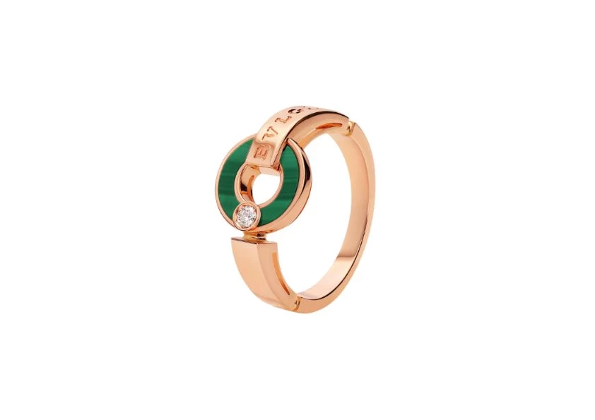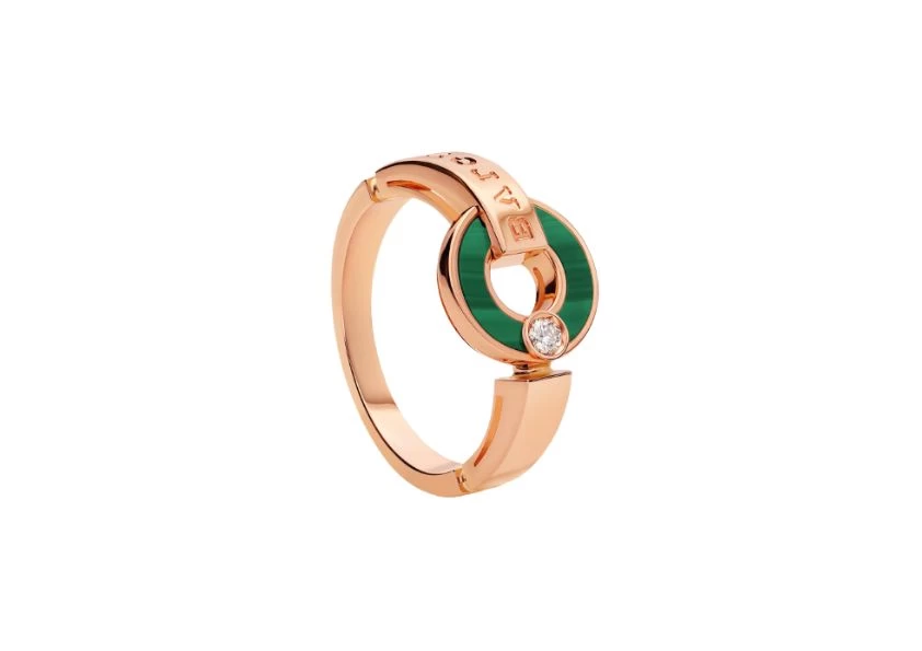 Introducing Preloved: BVLGARI BVLGARI Openwork 18 kt Rose Gold Ring, a true masterpiece that exudes elegance and sophistication. This exquisite piece is set with mesmerizing malachite elements and a dazzling round brilliant-cut diamond, making it a captivating statement of classiness.