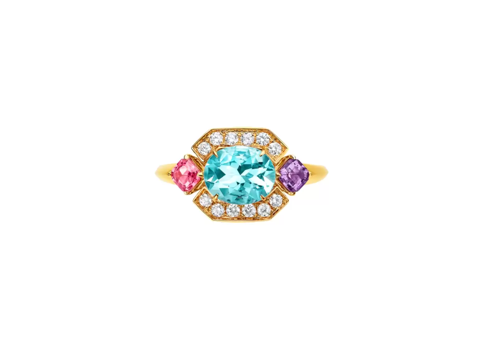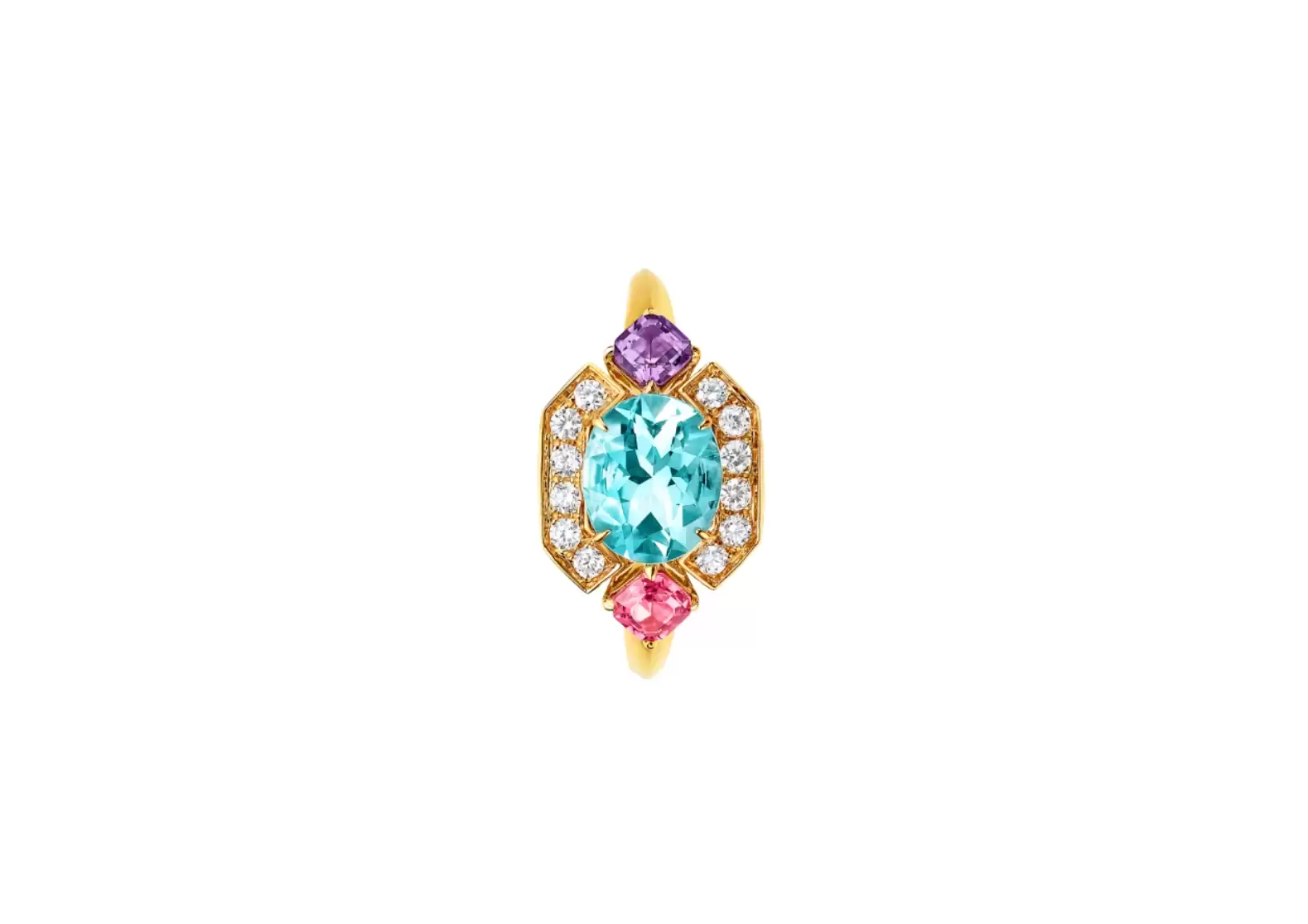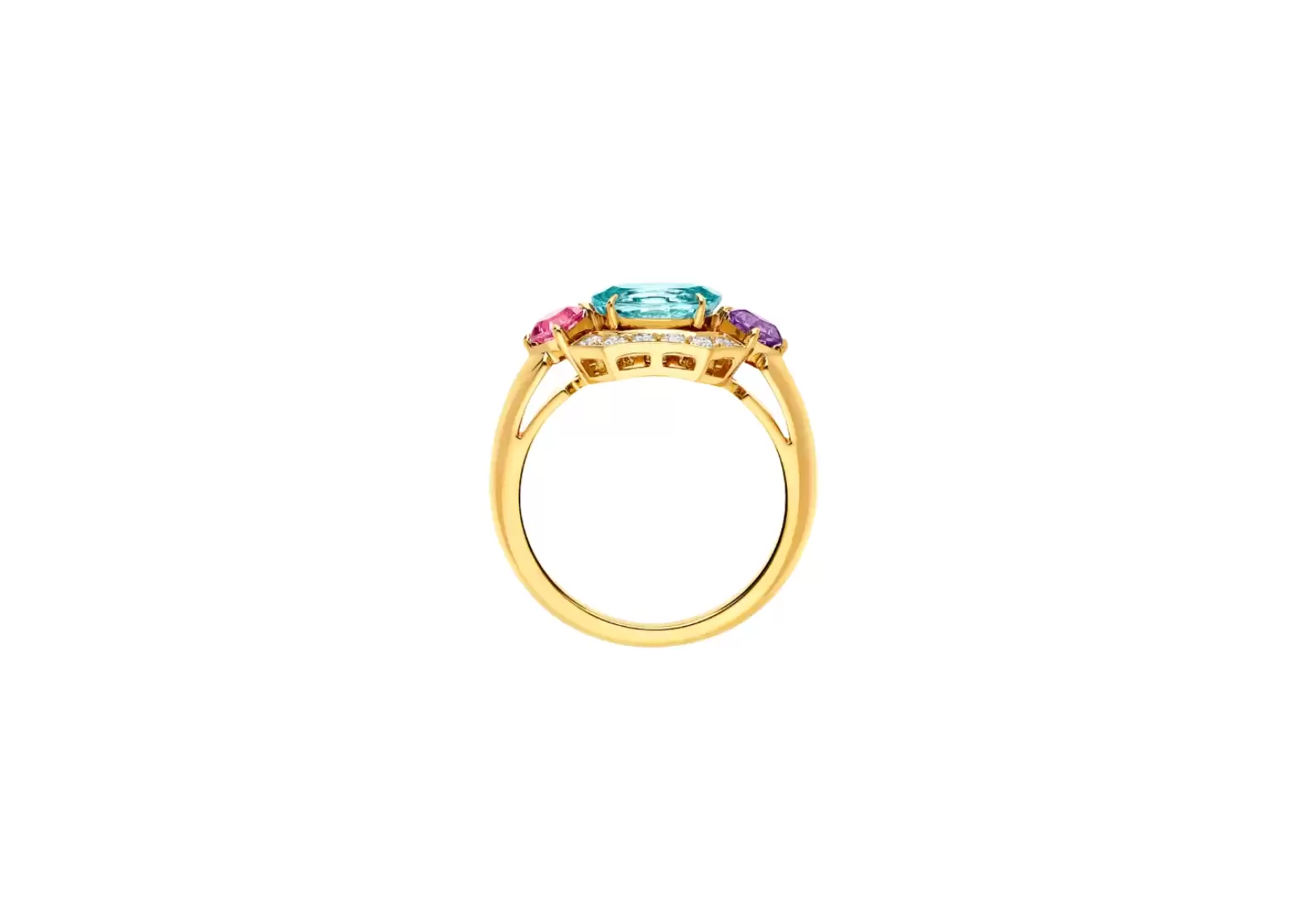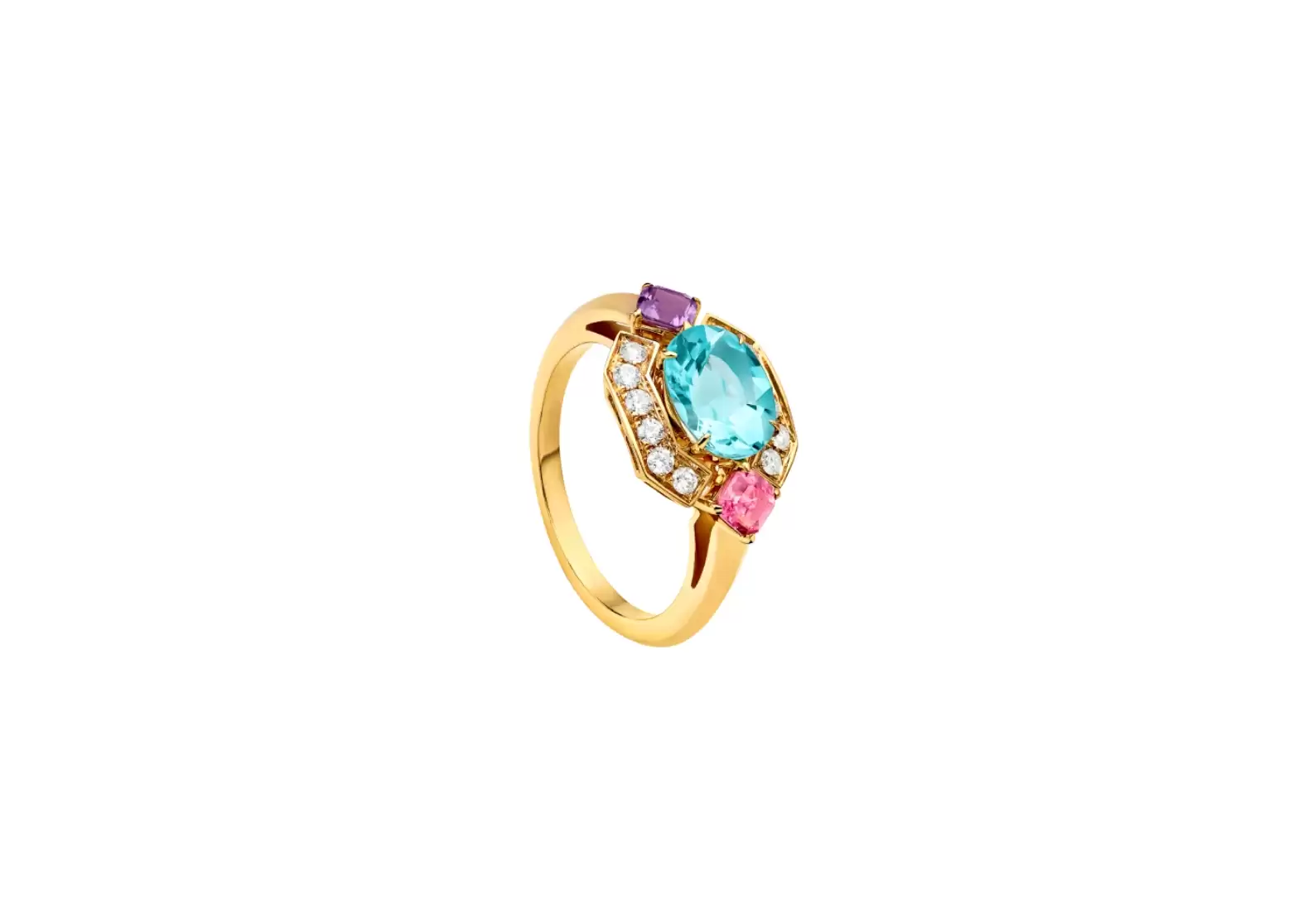 Introducing the exquisite Allegra 18 kt yellow gold ring, a true masterpiece that captures the essence of Bulgari's exuberant and bold approach to color. This stunning piece is adorned with a captivating cocktail of multi-shaped gemstones, guaranteed to leave you breathless. The Allegra ring is a celebration of vibrant nuances, designed to express pure joy through its radiant hues. Its effervescent beauty is brought to life by an enchanting combination of an aquamarine, an amethyst, and a pink tourmaline, each carefully selected for their exceptional brilliance and striking colors. These gemstones are skillfully arranged in a geometric and harmonious design, creating a visual feast for the eyes. To further enhance its allure, the Allegra ring is adorned with pavé diamonds, which delicately illuminate the gemstones and add a touch of timeless elegance. The interplay of cuts, shapes, colors, and lights in this piece is nothing short of mesmerizing, showcasing Bulgari's unparalleled craftsmanship. Not only is the Allegra ring a testament to Bulgari's commitment to creating extraordinary jewelry, but it also caters to the modern woman's need for versatility. Whether you're attending a glamorous event or adding a touch of sophistication to your everyday ensemble, this ring effortlessly complements any outfit and occasion. Crafted from 18 kt yellow gold, the Allegra ring exudes a warm and luxurious glow, making it a true statement piece. Its impeccable design and impeccable attention to detail make it a timeless addition to any jewelry collection. Indulge in the allure of the Allegra 18 kt yellow gold ring with aquamarine, amethyst, pink tourmaline, and pavé diamonds. Experience the joy of wearing a piece that embodies Bulgari's passion for color and craftsmanship, and let its vibrant beauty captivate you