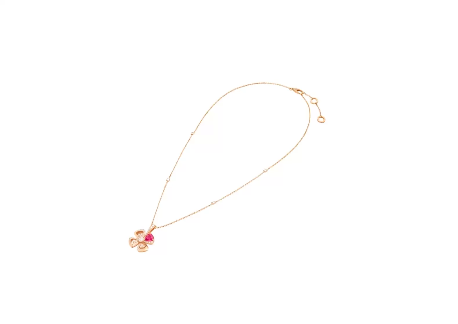 Introducing the Fiorever 18 kt rose gold pendant necklace set with a brilliant-cut diamond, a fancy-cut rubellite, and pavé diamonds. This exquisite piece is more than just a necklace; it is a symbol of happiness and joy, inspired by the captivating four-petal flower adored by the Romans. Crafted with meticulous attention to detail, this necklace showcases a gem-set corolla that blooms with elegance. The timeless allure of precious diamonds adds a touch of sophistication, while Bulgari's signature touch of color comes to life with a stunning rubellite petal. The interplay of volumes, shapes, and reflections creates a mesmerizing display that will capture the attention of all who see it. Made from 18 kt rose gold, this necklace exudes a sense of luxury and refinement. The brilliant-cut diamond sparkles with every movement, reflecting light in a dazzling dance. The fancy-cut rubellite adds a vibrant burst of color, creating a harmonious contrast against the shimmering pavé diamonds. Whether worn for a special occasion or as an everyday statement piece, the Fiorever pendant necklace is sure to turn heads and ignite conversations. Its beauty is timeless, and its design is a testament to Bulgari's commitment to craftsmanship and innovation. Indulge in the allure of the Fiorever 18 kt rose gold pendant necklace set with a brilliant-cut diamond, a fancy-cut rubellite, and pavé diamonds. Experience the joy of wearing a piece that not only complements your style but also celebrates the beauty of nature and the artistry of Bulgari.
