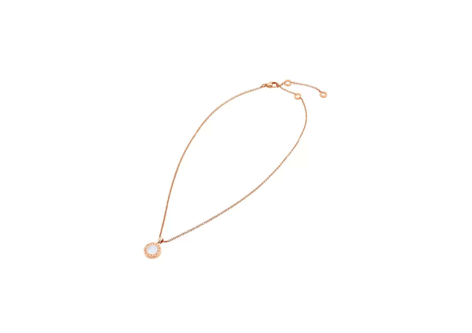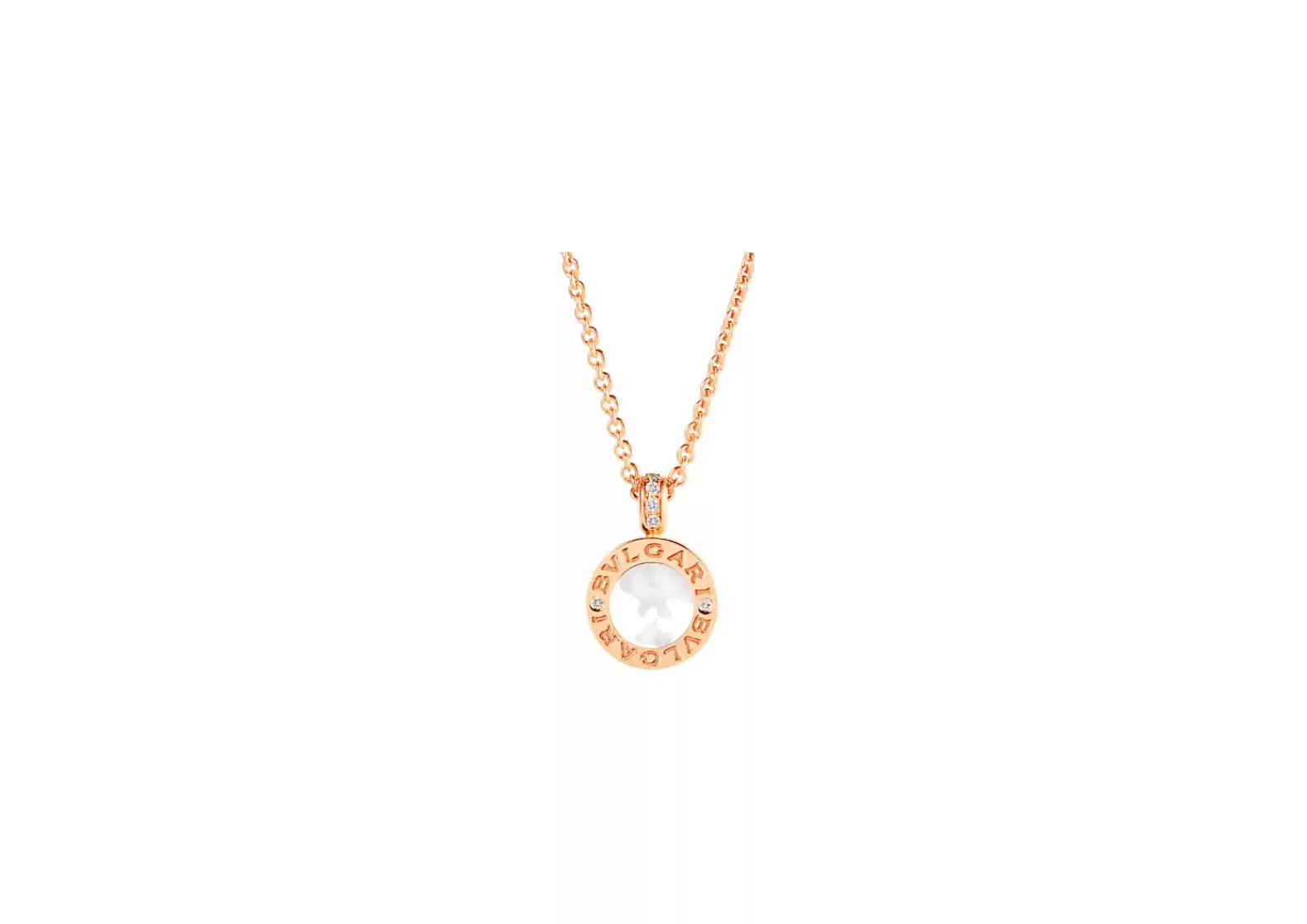 Introducing the exquisite Bvlgari necklace, a true masterpiece of elegance and sophistication. Crafted with utmost precision, this necklace features an 18 kt rose gold chain and pendant that exude a timeless charm. What sets this necklace apart is its double-faced design, showcasing round inserts of mother-of-pearl and carnelian. These two sides of the same beauty create a mesmerizing contrast, capturing the essence of duality and harmony. Drawing inspiration from the rich Roman heritage, the Bvlgari collection seamlessly blends tradition with contemporary aesthetics. The iconic double logo, reminiscent of ancient Roman coins, takes center stage, making a bold statement in the world of jewelry design. Meticulously crafted from 18 kt rose gold, the pendant is adorned with carnelian, mother-of-pearl, and pavé diamonds, totaling 0.12 ct. The combination of these precious gemstones adds a touch of opulence and brilliance to the necklace, elevating its allure to new heights. Indulge in the allure of the Bvlgari necklace, a true testament to Bulgari's unparalleled creativity and craftsmanship. Embrace the fusion of culture and modernity, and let this exquisite piece become a symbol of your unique style and refined taste.