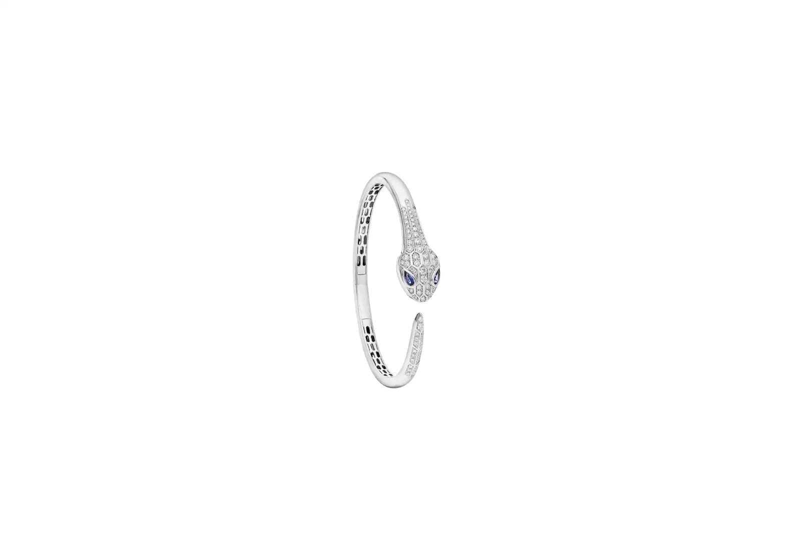 Introducing the magnificent Serpenti bangle bracelet in 18 kt white gold, adorned with mesmerizing blue sapphire eyes and a dazzling pavé diamond setting. This exquisite piece captures the essence of allure and fascination, exuding an aura of glamour and refinement.