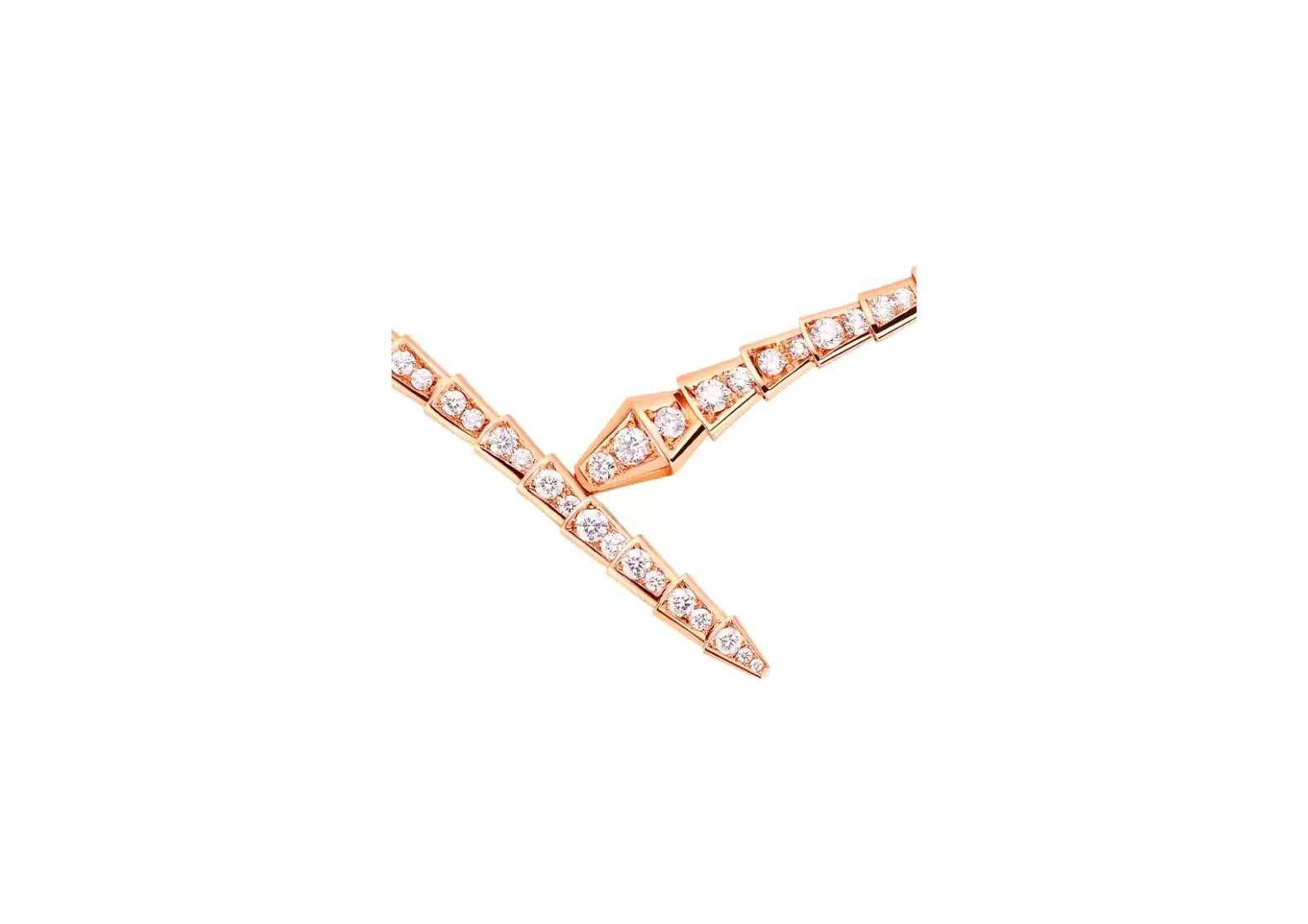 Introducing the Serpenti Viper 18 kt rose gold necklace set with pavé diamonds - a mesmerizing masterpiece that embodies Bulgari's timeless symbol of metamorphosis and unstoppable transformation. Prepare to be captivated by its ultra-modern interpretation and sleek sensuality.