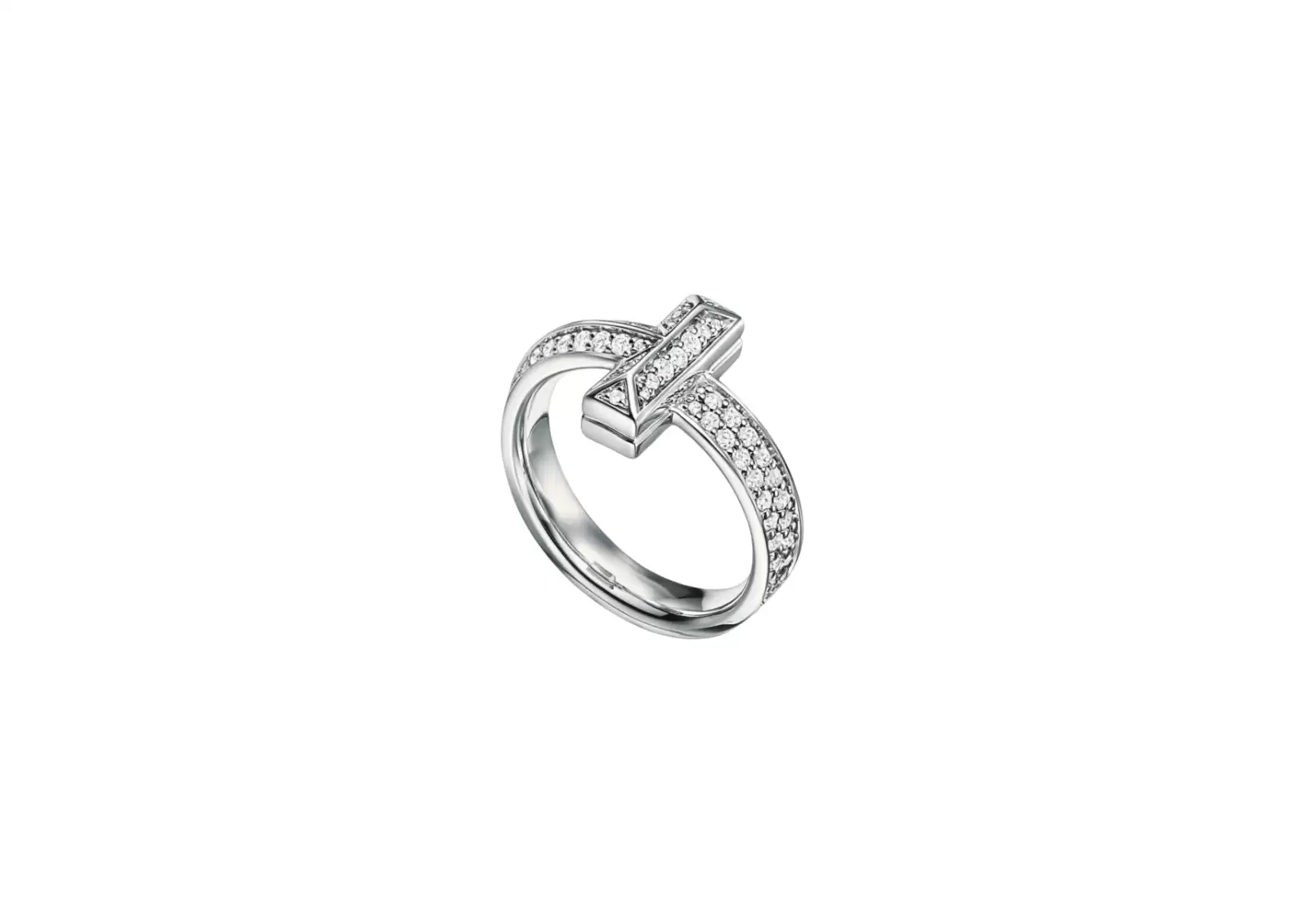 Introducing the Preloved: Tiffany T T1 Ring in White Gold with Diamonds, 4.5 mm Wide I 68170036. This exquisite piece is adorned with pavé diamonds, creating a captivating radiance that effortlessly catches the light. A reinvention of a Tiffany classic, the Tiffany T1 collection embodies individual strength and eternal power, allowing you to outwardly express your inner essence.