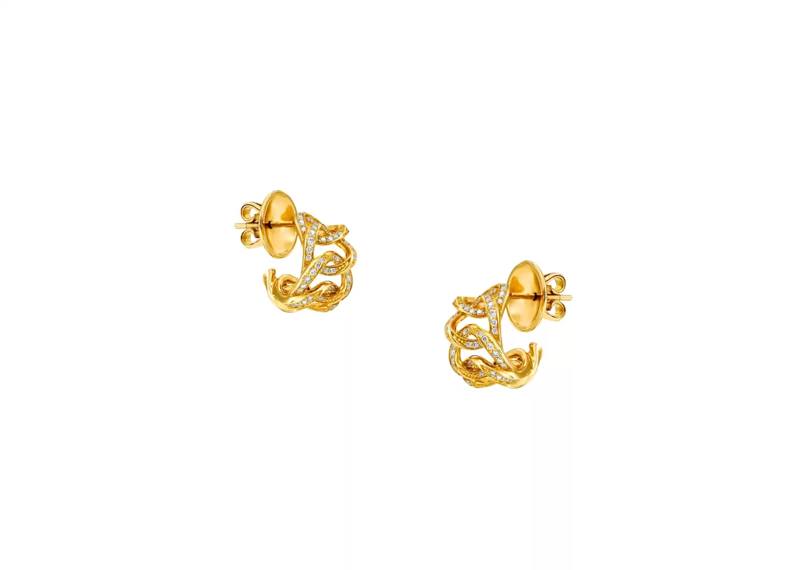 Crafted in yellow gold, these earrings feature a swirling design that elegantly loops around the ear, creating a captivating and unique look. Each pavé stone is meticulously positioned by hand, showcasing the absolute precision and attention to detail that goes into creating these stunning pieces.