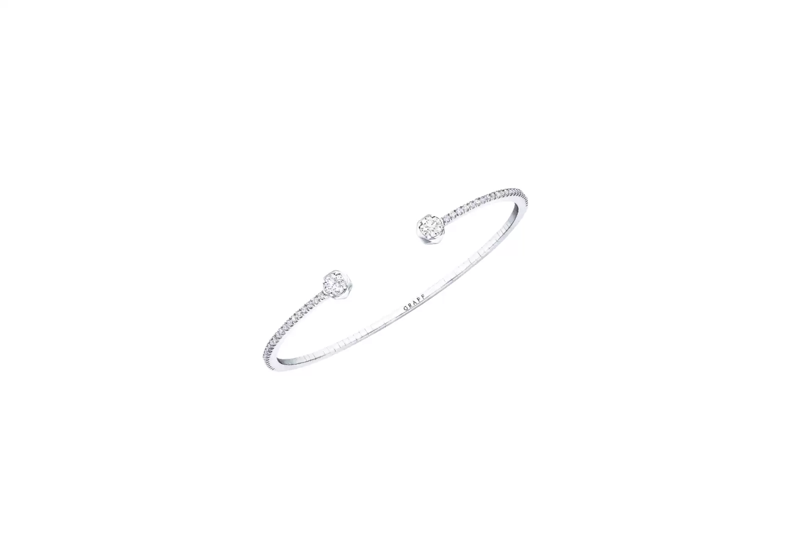 What sets this bangle apart is the sleek stream of diamonds that unites the solitaires, creating a mesmerizing visual display. The faceted setting itself is a striking interpretation of the facets of a diamond, paying homage to the very stone that has become synonymous with the House of Graff.