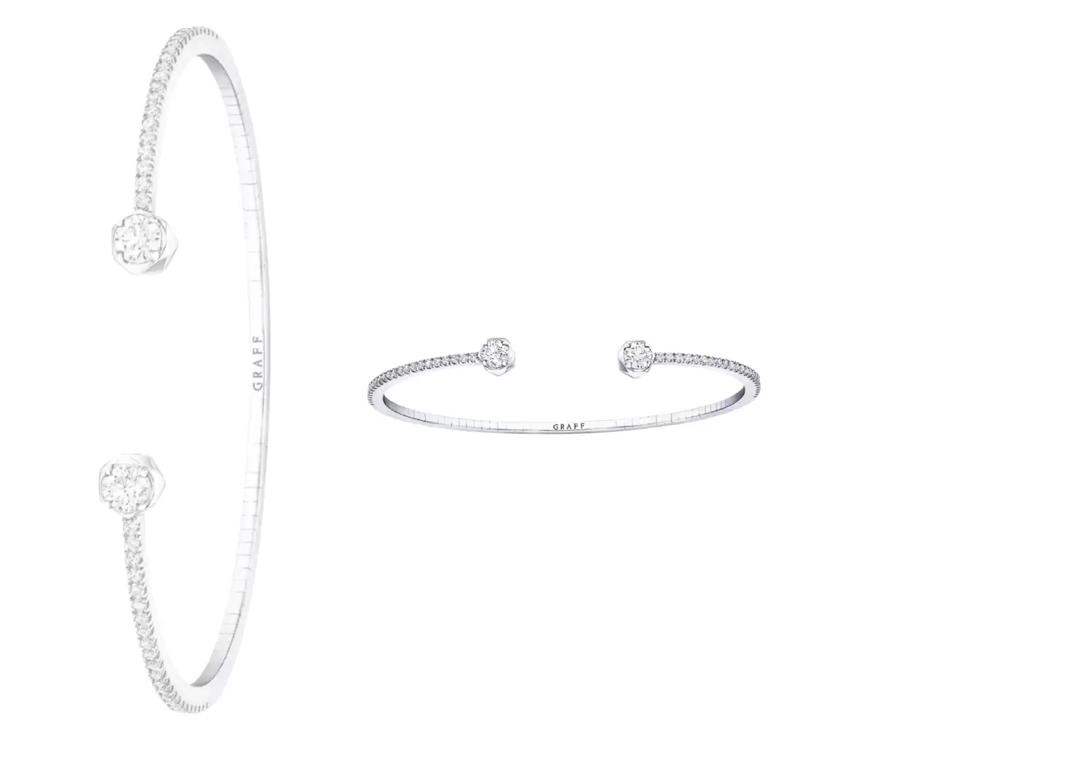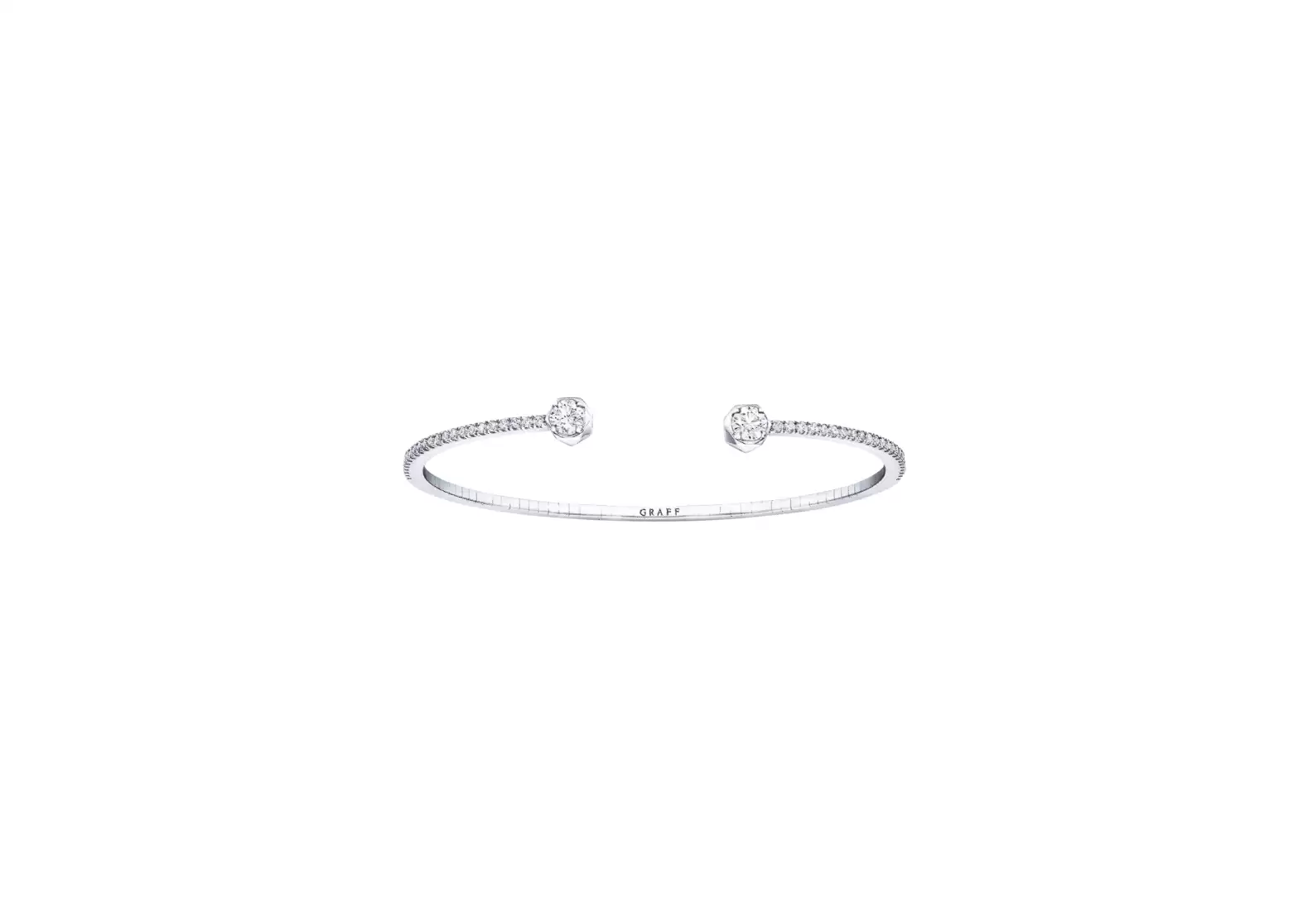The bangle features two solitaire diamonds, delicately framed by the faceted Laurence Graff Signature bezel setting. These dazzling diamonds scintillate upon the wrist, capturing the essence of timeless elegance.