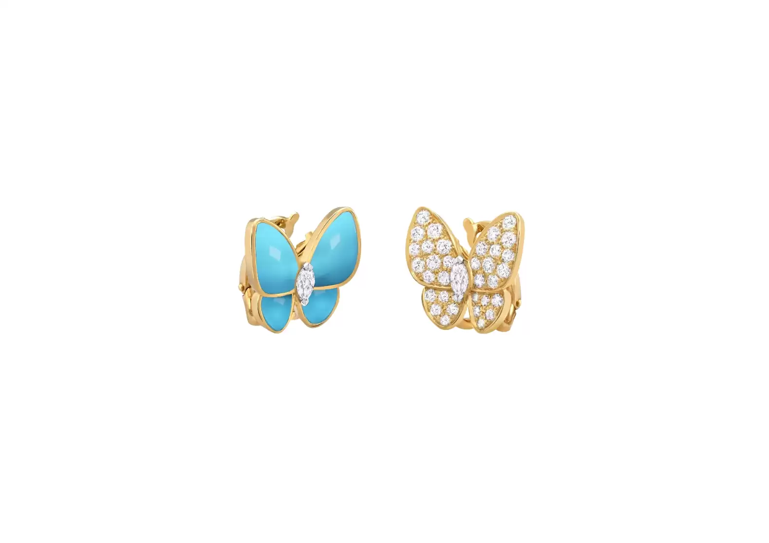 The marquise-cut diamonds further enhance the uniqueness of these earrings, adding a touch of elegance and sophistication. The combination of the marquise-cut diamonds with the turquoise stones creates a harmonious balance between classic and contemporary design elements.