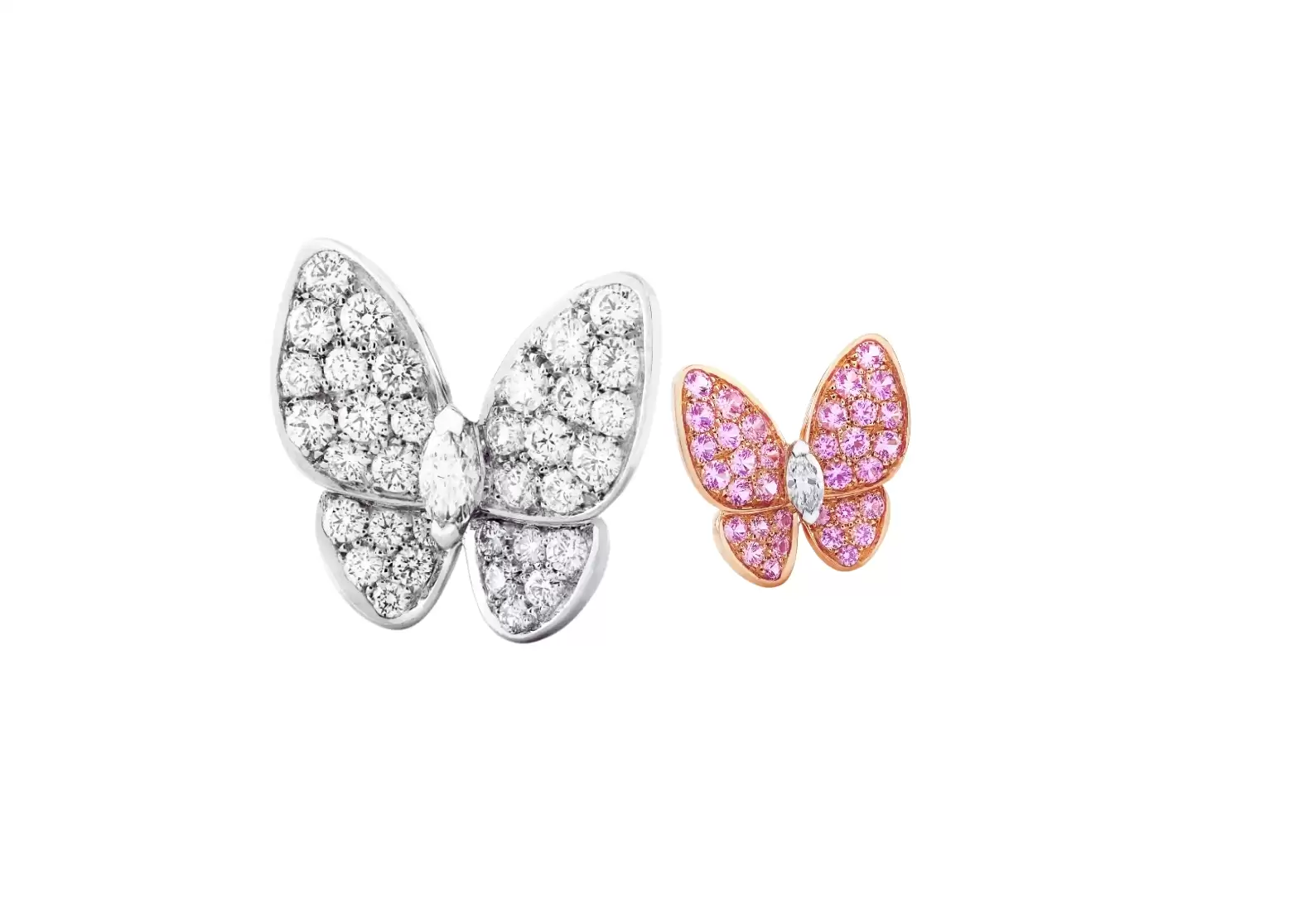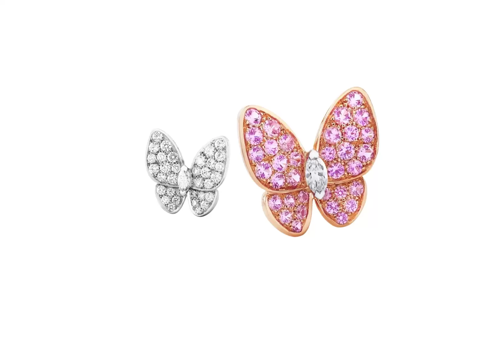 Introducing the exquisite Preloved Two Butterfly earrings, a dazzling piece of jewelry that effortlessly combines elegance and sophistication. Crafted with utmost precision, these earrings are made from 18K rose gold, ensuring a timeless appeal that will never go out of style. The centerpiece of these earrings is the round pink sapphires, which add a touch of femininity and grace. With 34 stones totaling 0.88 carats, these sapphires create a stunning visual display that is sure to turn heads. The sapphires are further enhanced by the rhodium plated 18K white gold, which adds a lustrous shine and durability to the overall design. To elevate the glamour quotient, these earrings also feature round and marquise-cut diamonds. With a total of 36 stones weighing 0.99 carats, these diamonds are of exceptional quality, ranging from DEF, IF to VVS. Their brilliance and sparkle will captivate anyone who lays eyes on them, making these earrings a true statement piece. Whether you're attending a formal event or simply want to add a touch of luxury to your everyday look, the Preloved Two Butterfly earrings are the perfect choice. With their stunning design and impeccable craftsmanship, they are guaranteed to become a cherished addition to your jewelry collection. Don't miss out on the opportunity to own these extraordinary earrings. Embrace the allure of 18K rose gold, the enchantment of pink sapphires, and the brilliance of diamonds with the Preloved Two Butterfly earrings. Order now and experience the epitome of elegance.