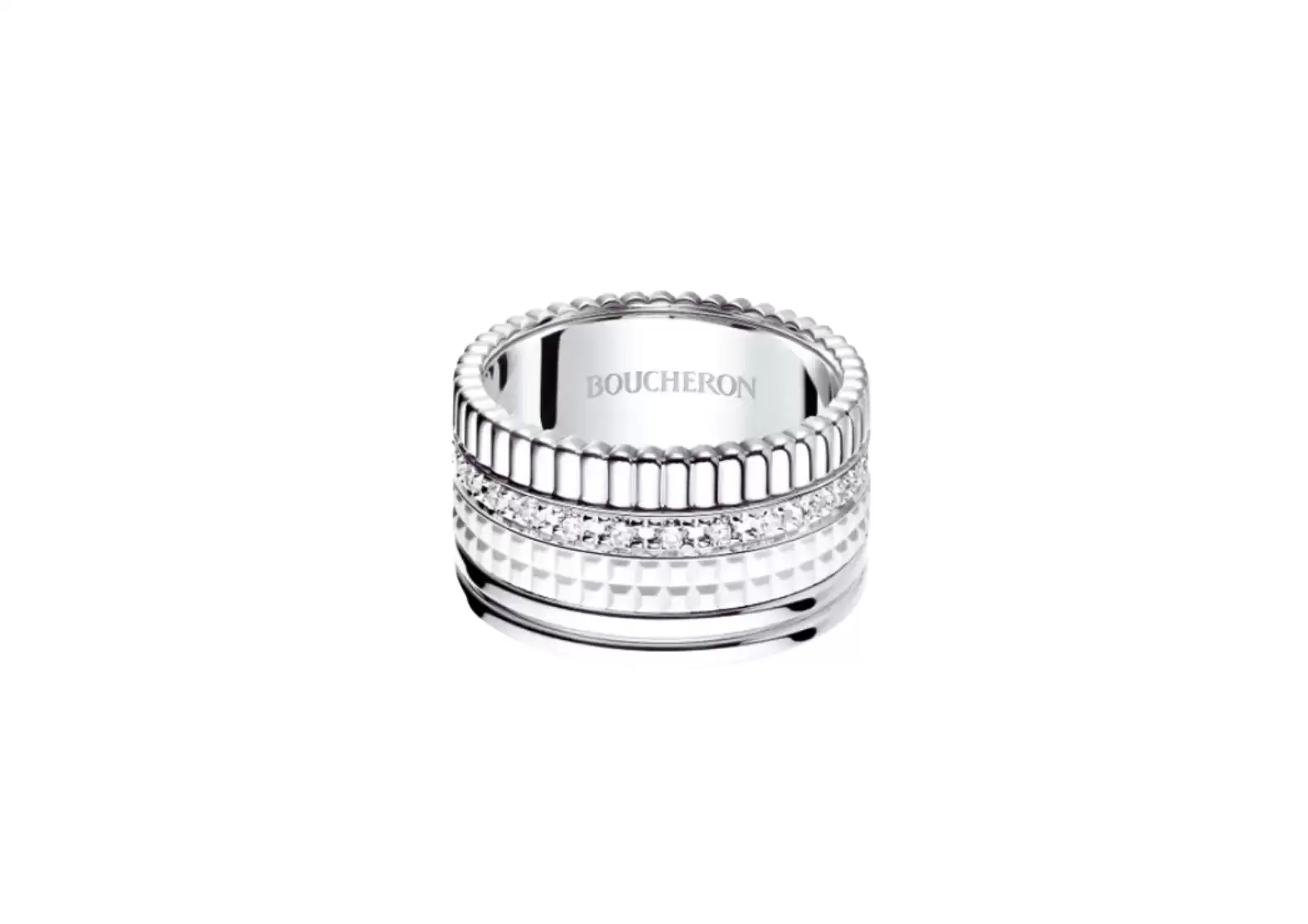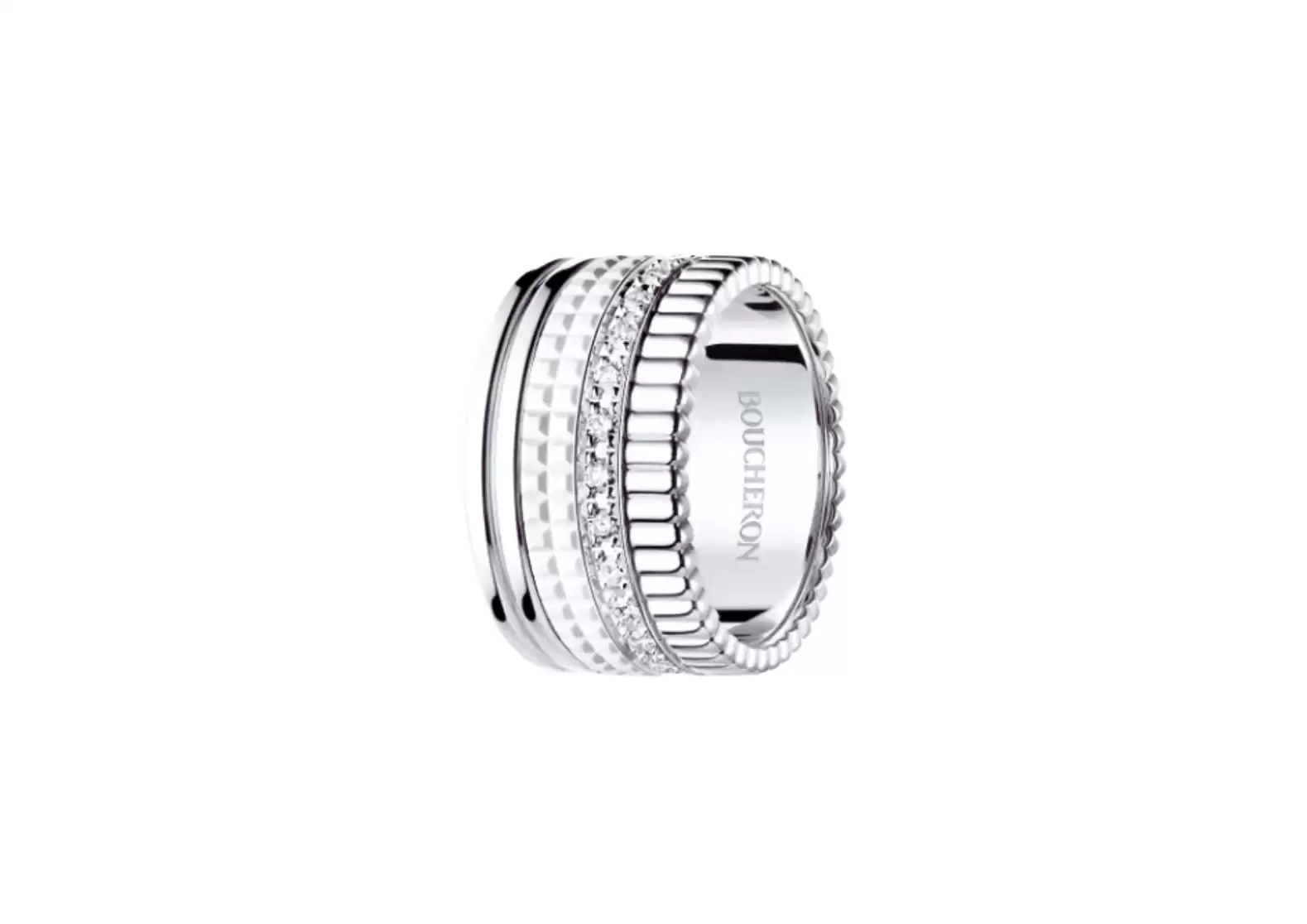Made from 18-carat white gold, this ring showcases a flawless combination of luxurious materials. The addition of white ceramic adds a touch of modernity, creating a unique and captivating design that effortlessly stands out.