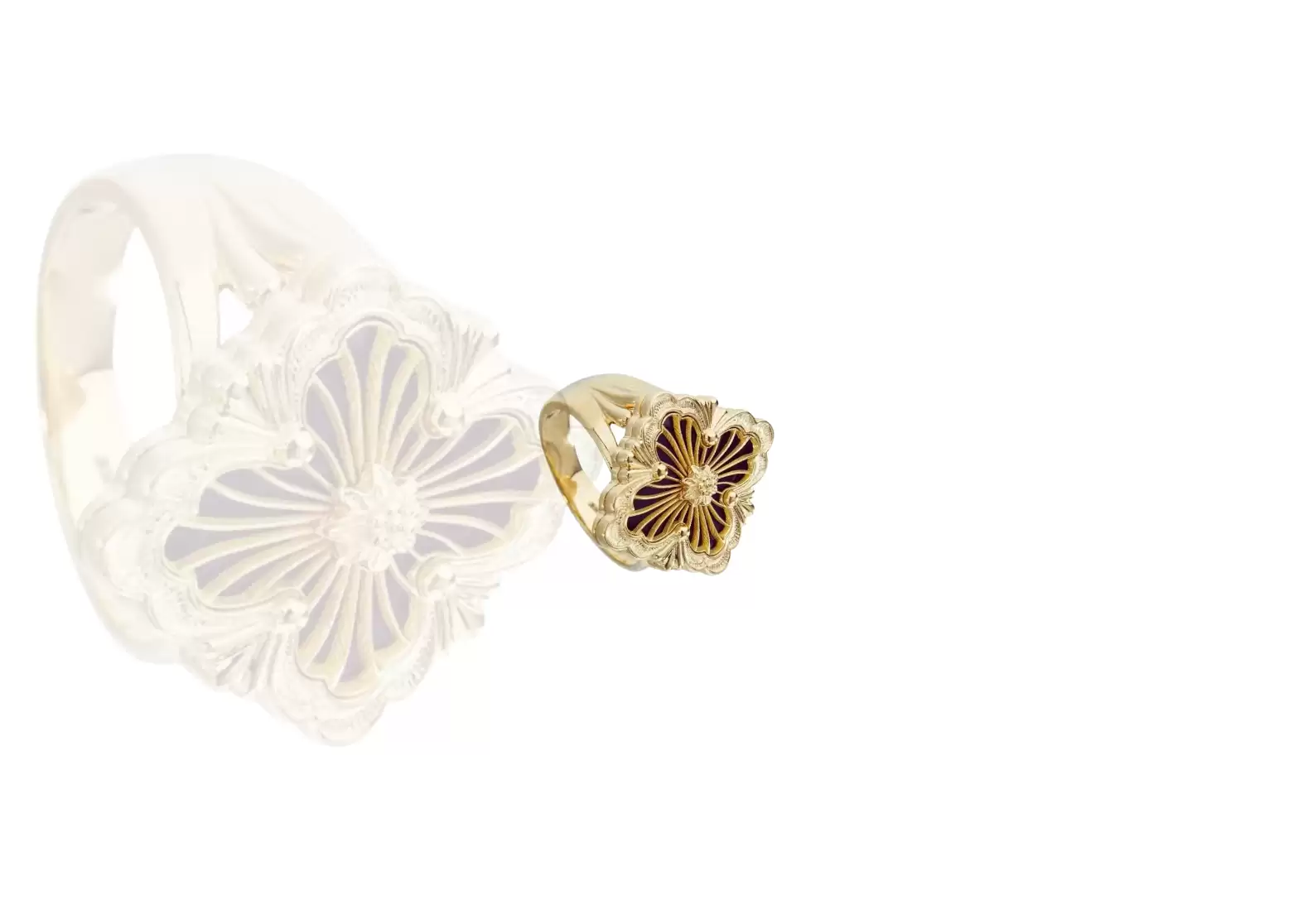 Introducing the exquisite Preloved: Opera Tulle Ring in yellow gold, adorned with a mesmerizing onyx gemstone. This enchanting piece showcases a captivating logo element crafted in lustrous yellow gold, set against a striking onyx background. The ring is further enhanced with a delicate radial tulle design, elegantly culminating in a charming yellow gold rosette at its center.