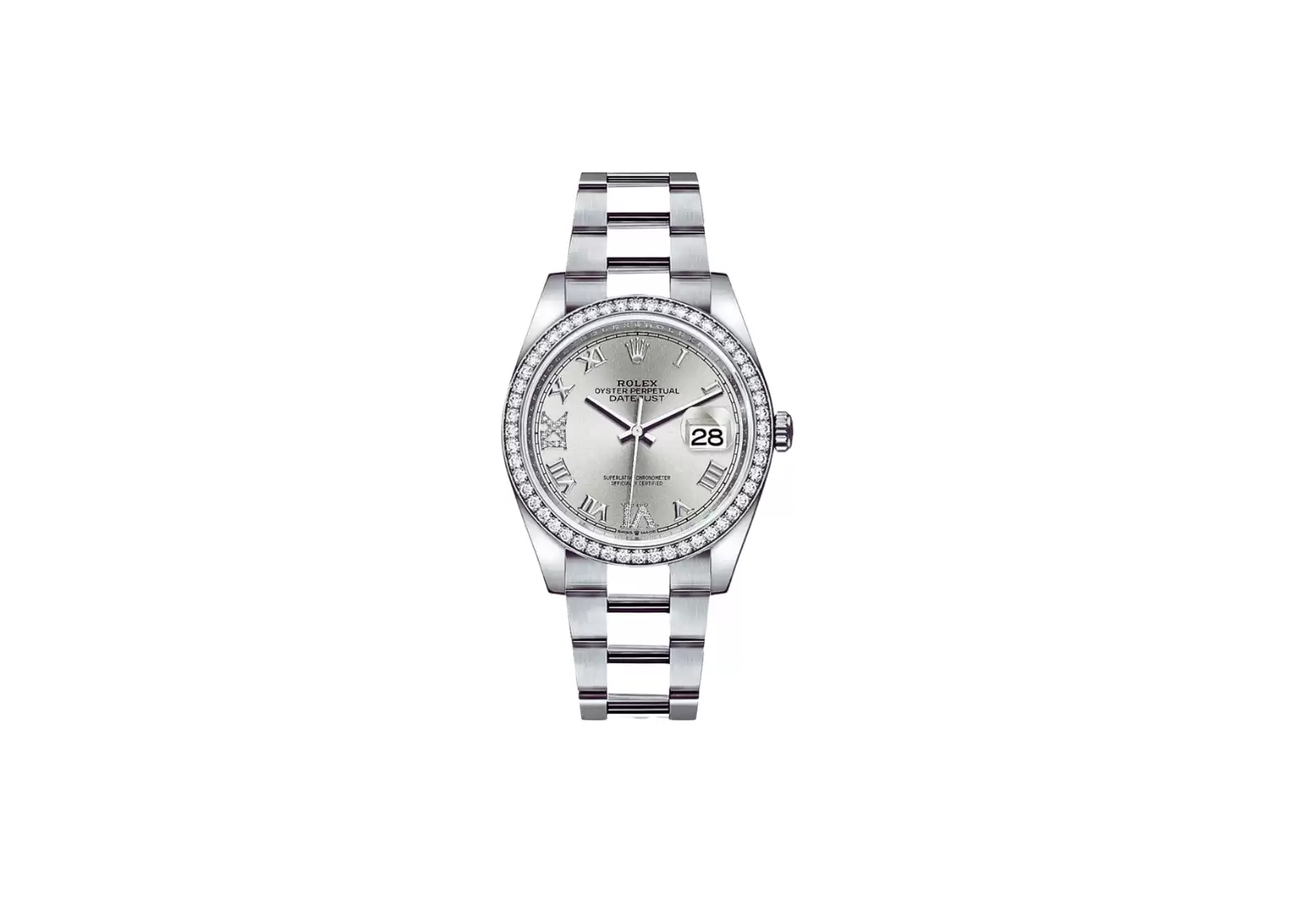 Crafted with precision and attention to detail, this watch features a silver dial with Roman numeral hour markers, exuding a classic and sophisticated appeal. The Roman VI and IX hour markers are adorned with 24 dazzling diamonds, adding a touch of glamour to the overall aesthetic.