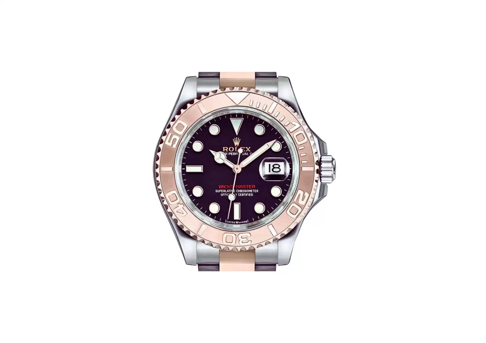 The polished 904L Oystersteel stainless steel case and bracelet, combined with the brushed 904L Oystersteel stainless steel with polished solid 18k Everose gold oyster bracelet, exude a timeless elegance. The scratch-resistant sapphire crystal protects the watch face, while its 100 meters/330 feet waterproof rating ensures durability.