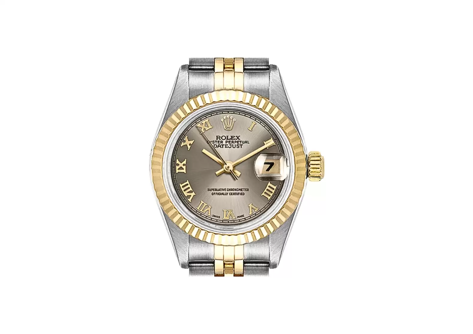 Introducing the Pre-owned Rolex Lady-Datejust 26 Yellow Gold & Stainless Steel Women's Watch 69173. This luxurious timepiece exudes elegance and sophistication, making it the perfect accessory for any woman who appreciates fine craftsmanship.