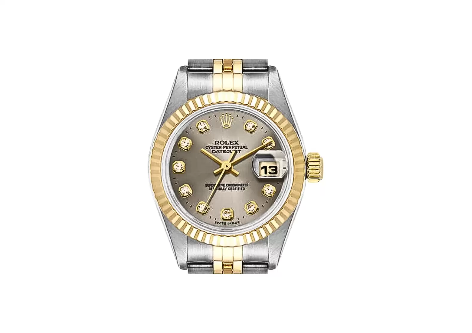 Introducing the Pre-owned Rolex Lady-Datejust 26 Grey Diamond Dial Women's Watch 79173. This exquisite timepiece is a symbol of luxury and elegance, perfect for the sophisticated woman.