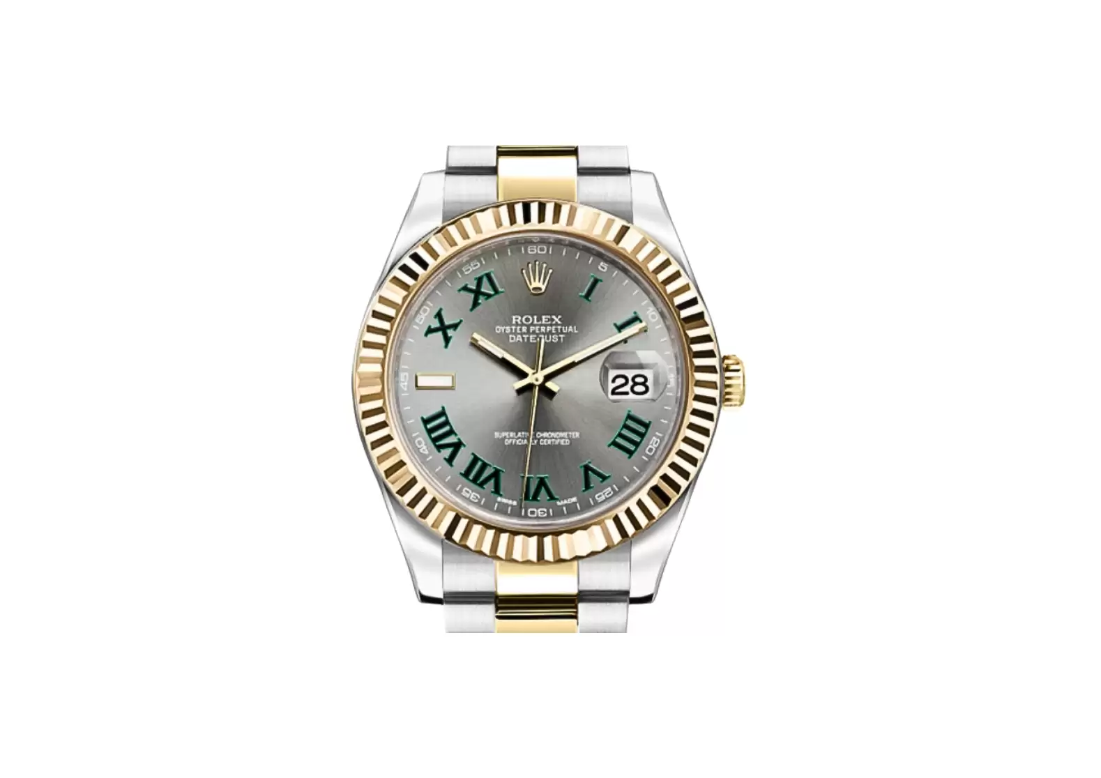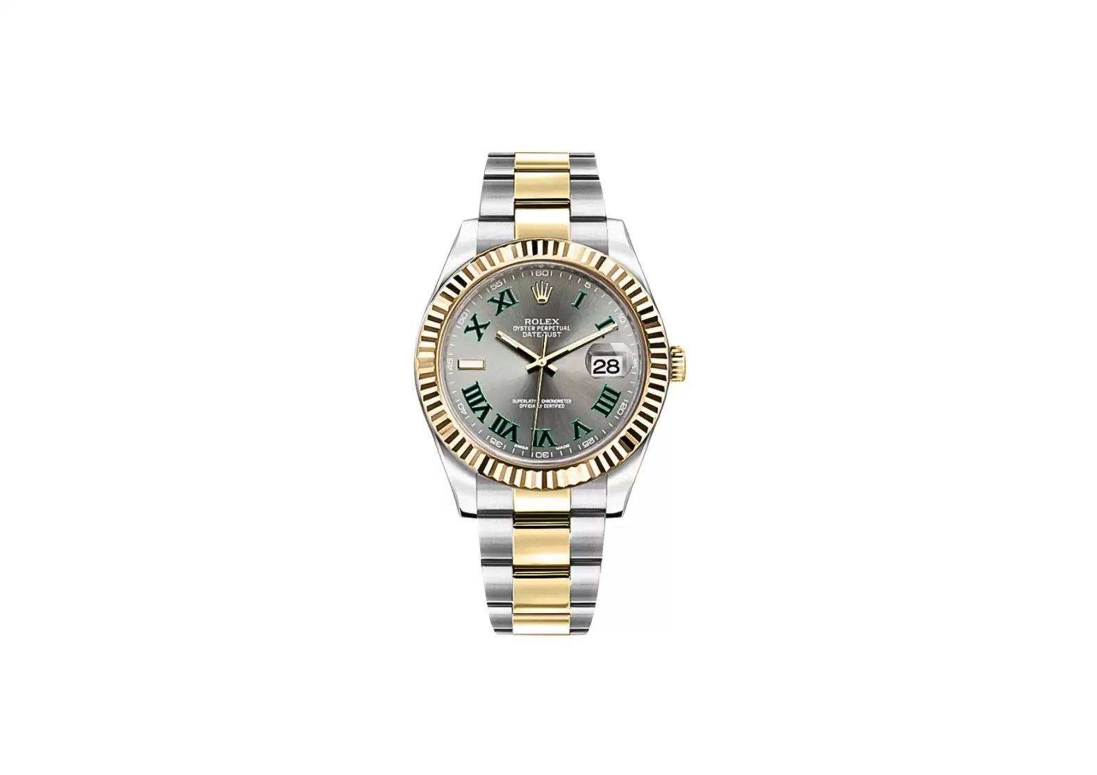Crafted with precision and attention to detail, this Swiss-made watch boasts a slate grey Wimbledon dial adorned with green Roman numeral hour markers, creating a striking and elegant contrast. The polished solid 18k yellow gold fluted bezel adds a touch of opulence to the overall design.