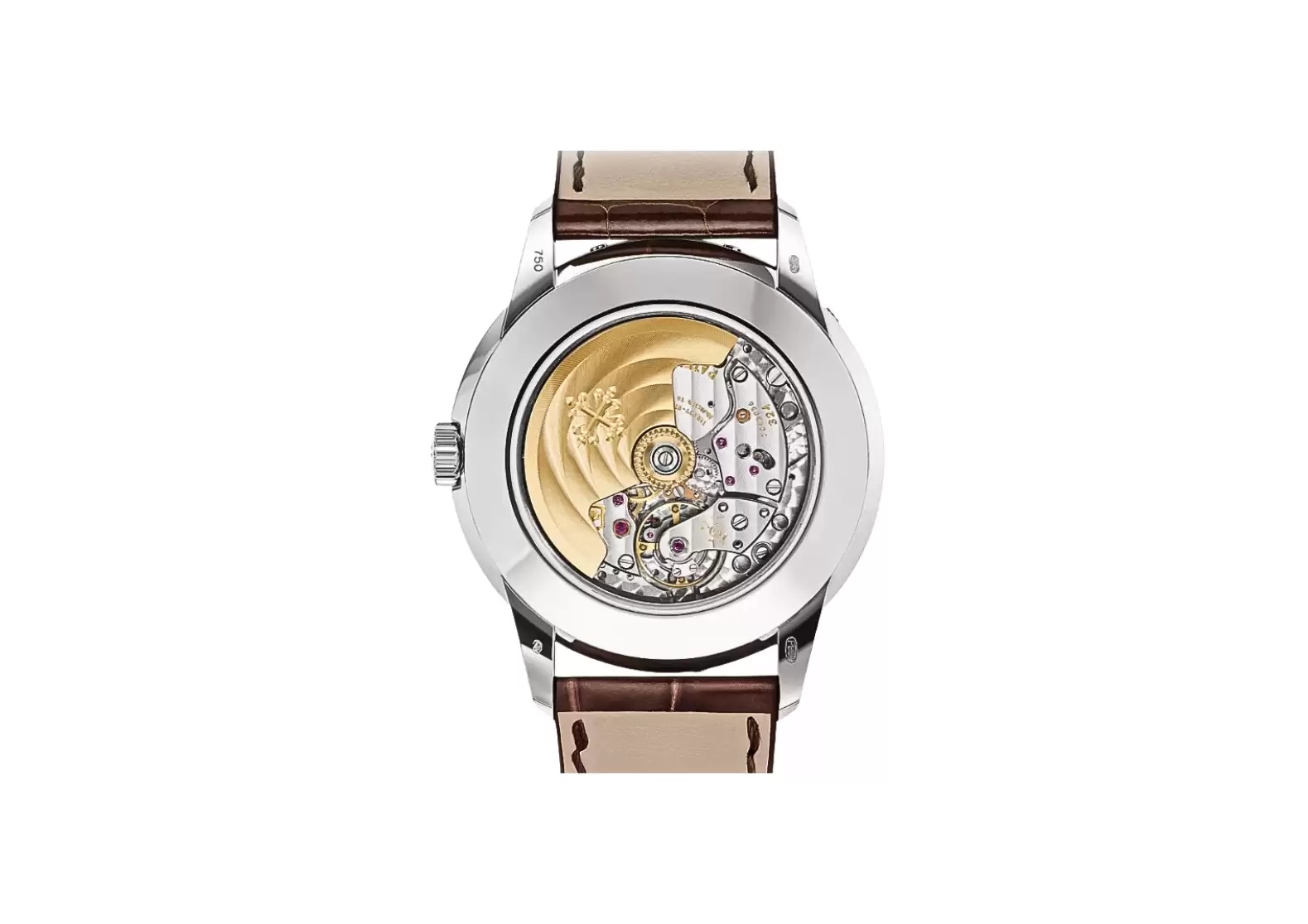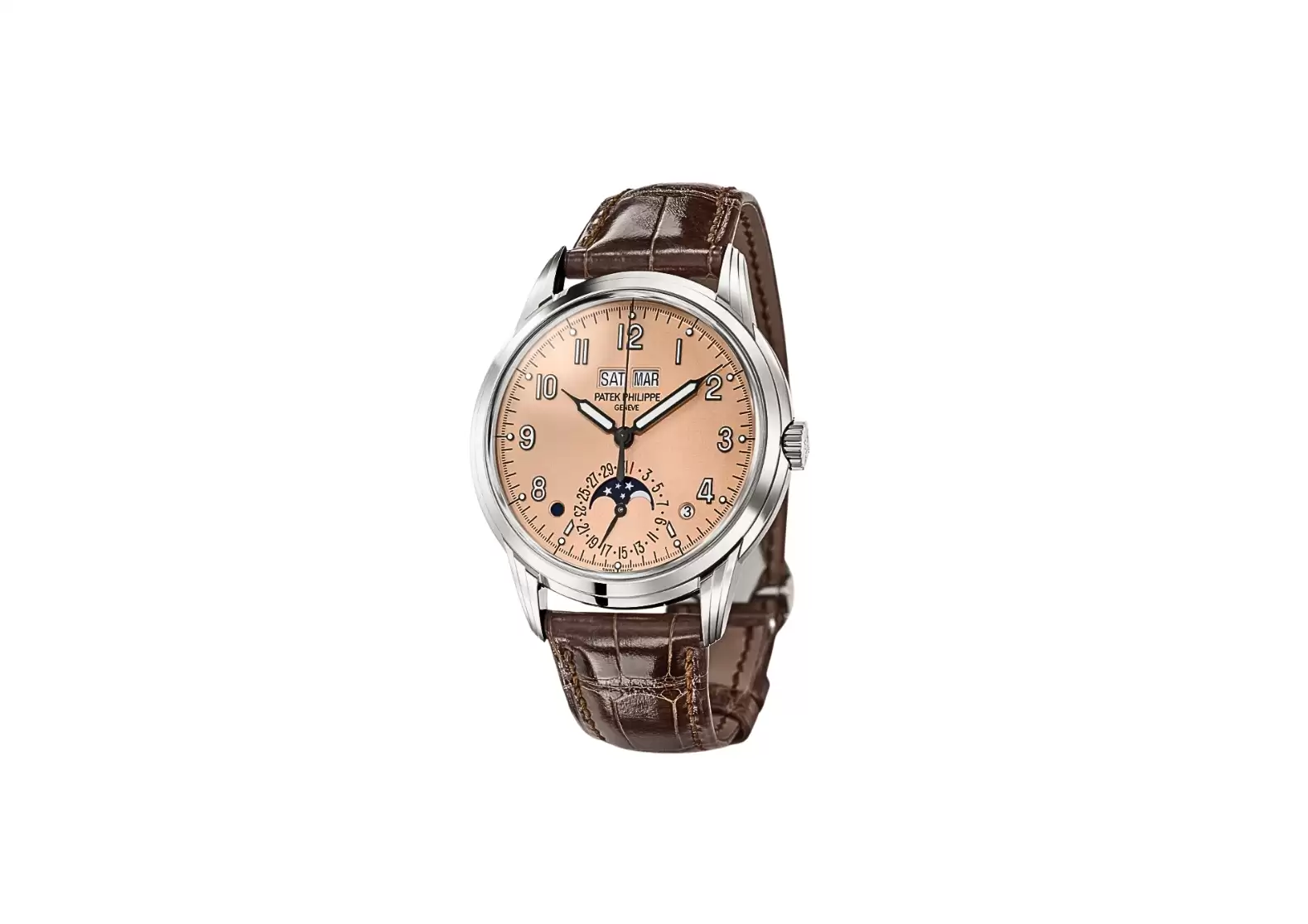 The calendar displays of this timepiece are thoughtfully arranged, staying true to the iconic Patek Philippe perpetual calendar watches since 1941. At the 12 o'clock position, you'll find a twin in-line day/month aperture, while the date is elegantly indicated by a hand encircling a moon-phase aperture at 6 o'clock. Enhancing its functionality, two round apertures are present: one for day/night indication between 7 and 8 o'clock, and another for the leap-year cycle between 4 and 5 o'clock. These additional features prove to be invaluable when adjusting the calendar.