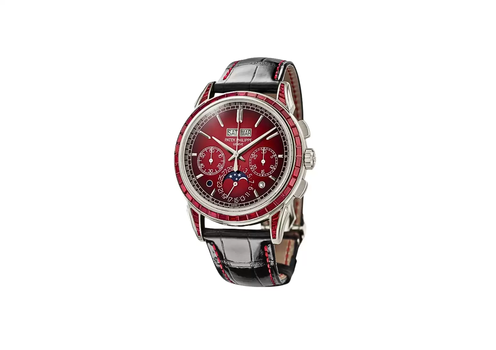 The gemsetting of the Patek Philippe 5271/12P-010 is truly remarkable. The bezel and lugs are adorned with 58 baguette-cut rubies, totaling 4.11 carats, while the fold-over clasp features an additional 22 baguette-cut rubies, totaling 1.14 carats. The total of 80 baguette-cut rubies adds a luxurious touch to this already exceptional timepiece.