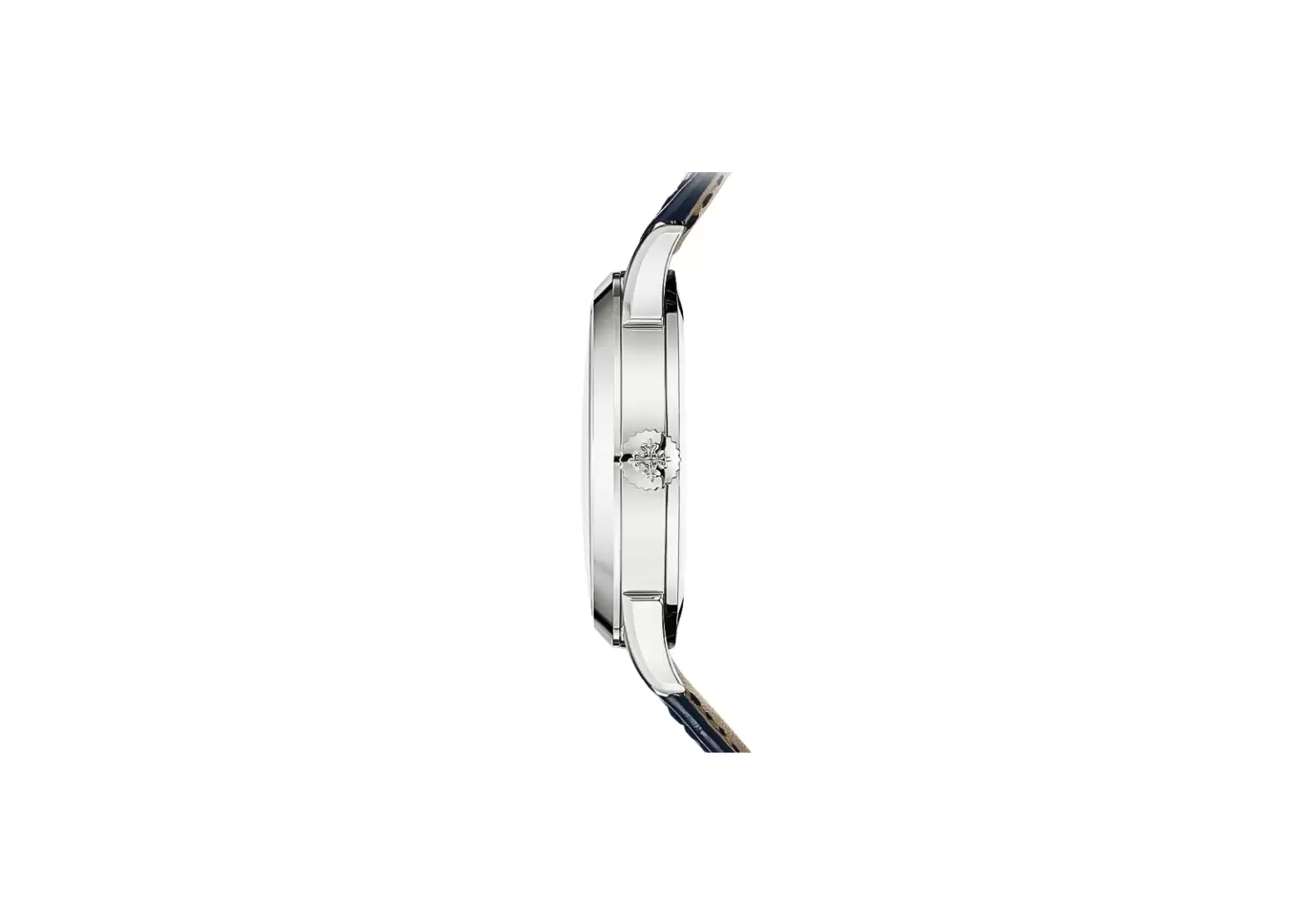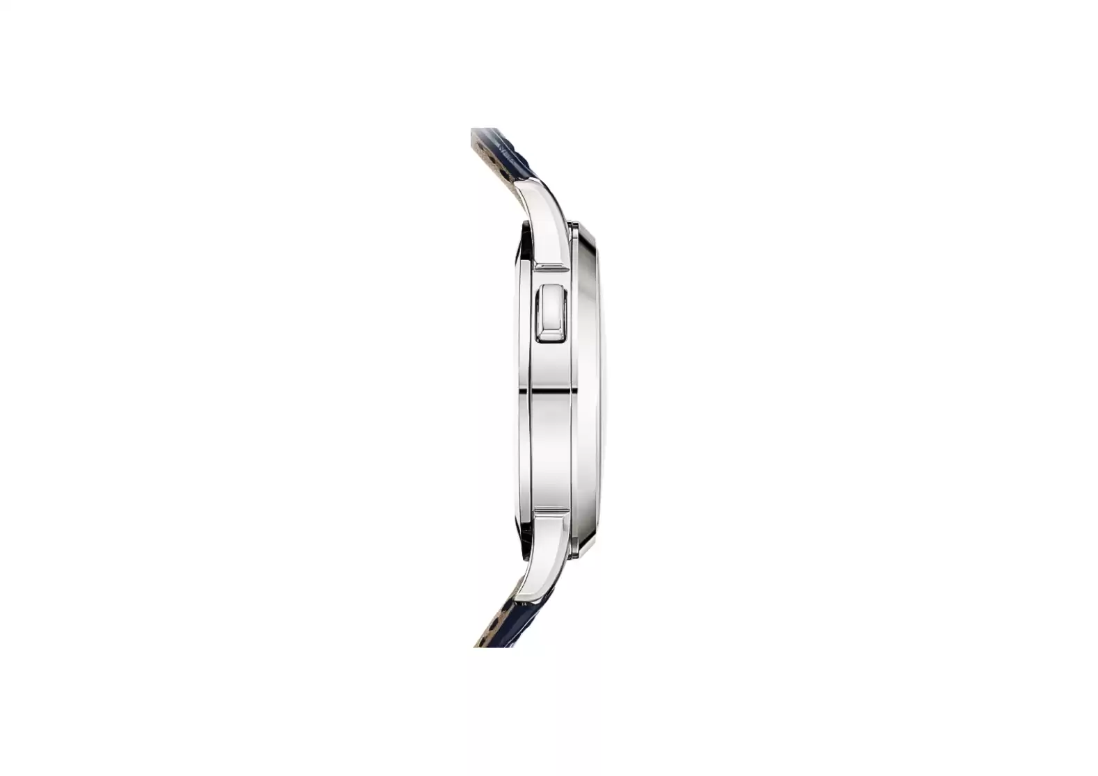 Completing the ensemble is a strap crafted from luxurious alligator leather, featuring square scales and a hand-stitched design in a matte navy blue hue. The fold-over clasp ensures a secure and comfortable fit, making this timepiece a true pleasure to wear.